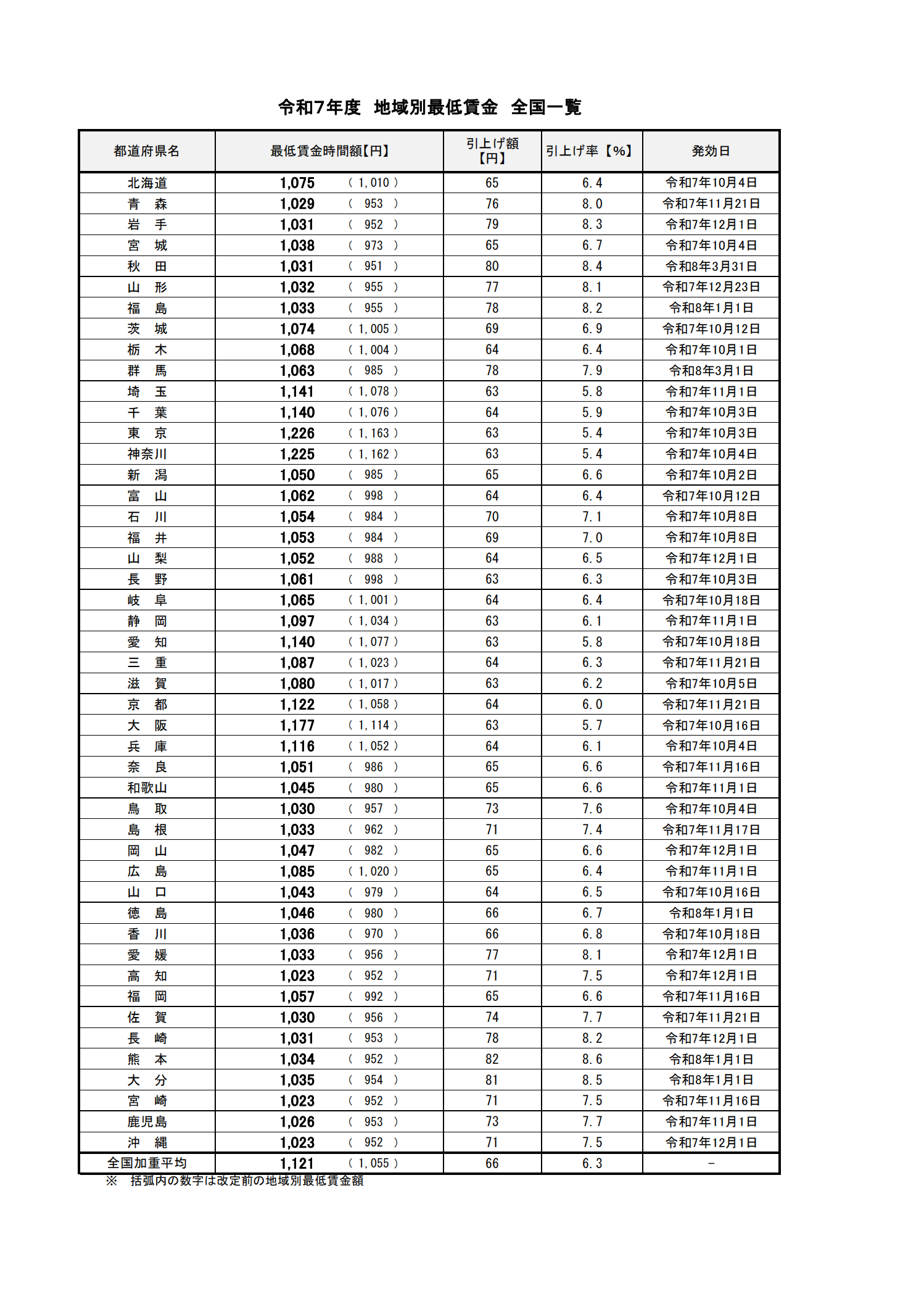 一、以下是2025年10月起實施的日本最低時薪明細: